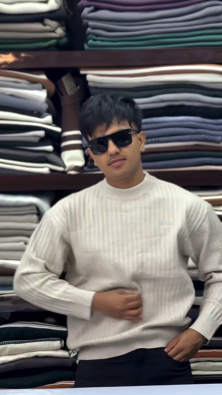 The model pairs the sweater with black sunglasses, adding a confident and fashionable vibe to the look. The backdrop consists of neatly folded sweaters arranged on wooden shelves, emphasizing a winter collection display in a clothing store. This setting reinforces the idea that the sweater is part of a trendy seasonal lineup.