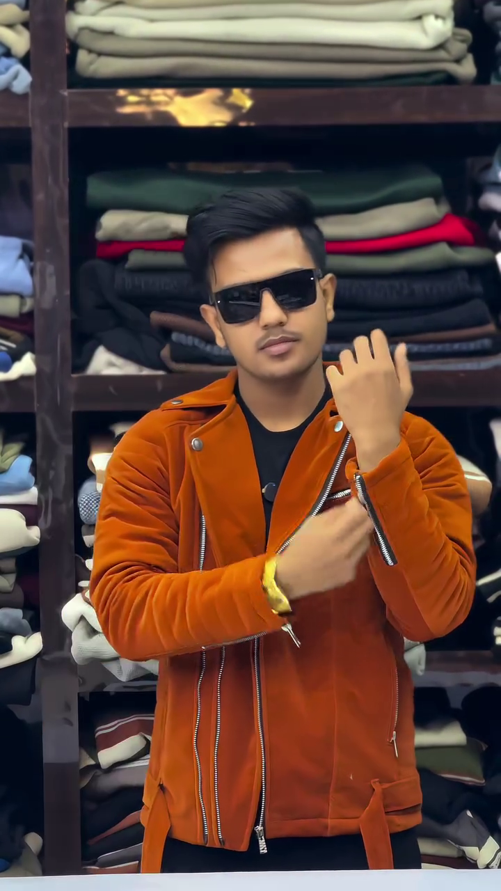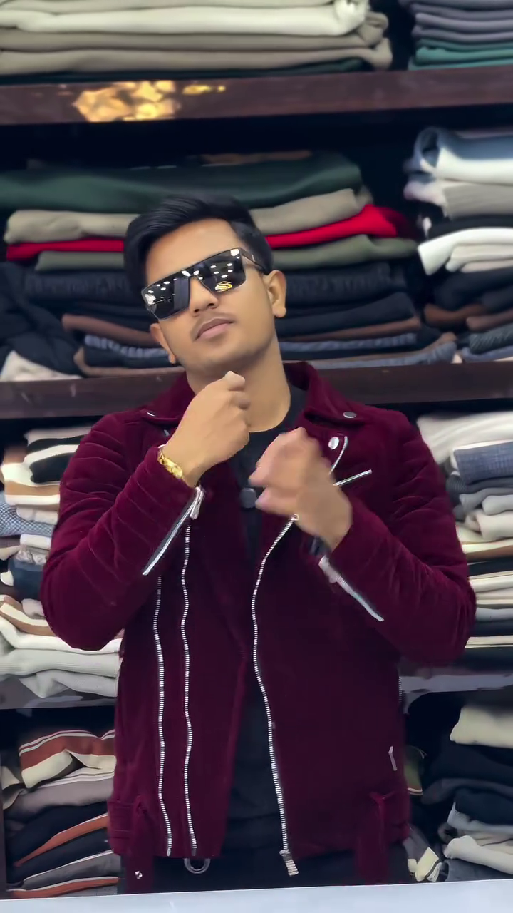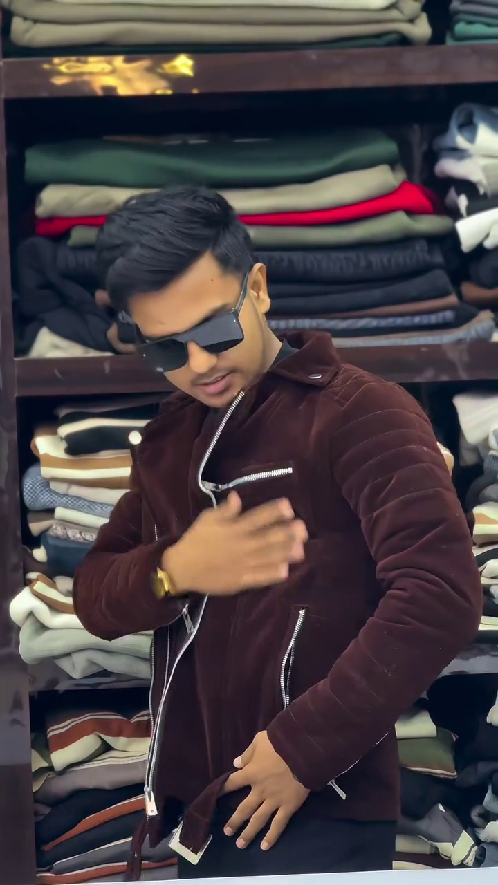 The background shelves display folded sweaters and jackets, reinforcing the winterwear theme. This piece is perfect for parties, night outings, or casual fashion statements. It offers warmth while maintaining a trendy and bold aesthetic.