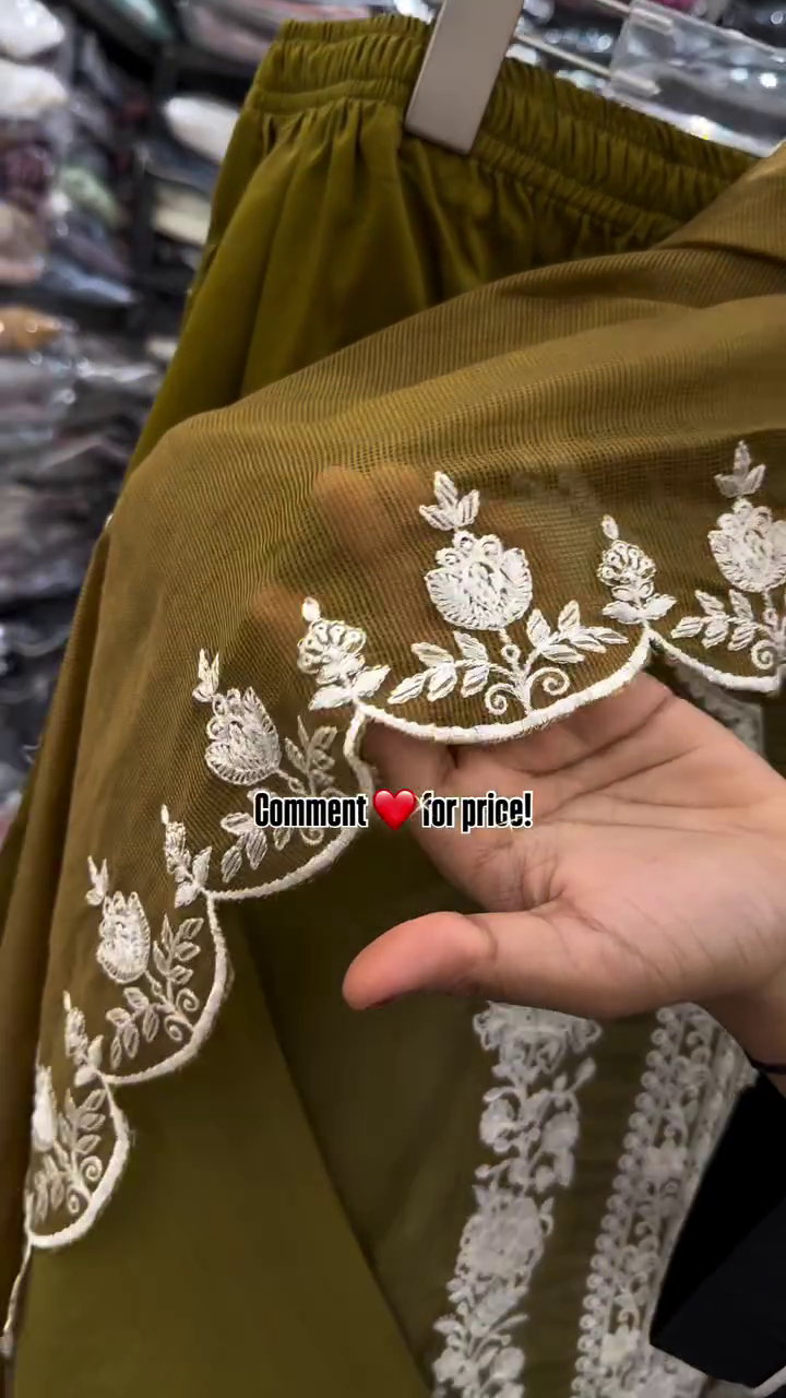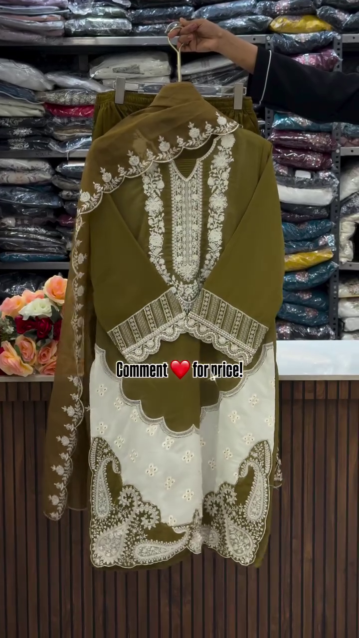 In the background, shelves stacked with neatly folded garments create a boutique ambiance, reinforcing that this piece is part of a curated fashion collection. The soft floral arrangement placed nearby adds warmth and elegance to the presentation.