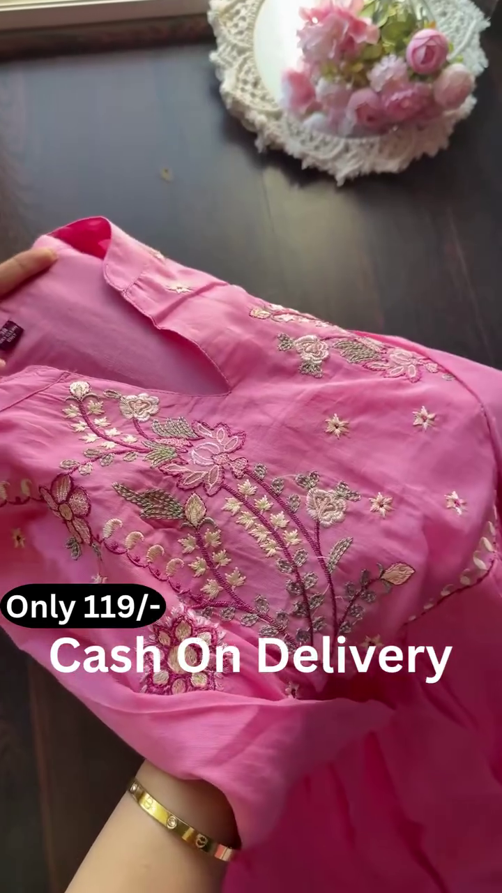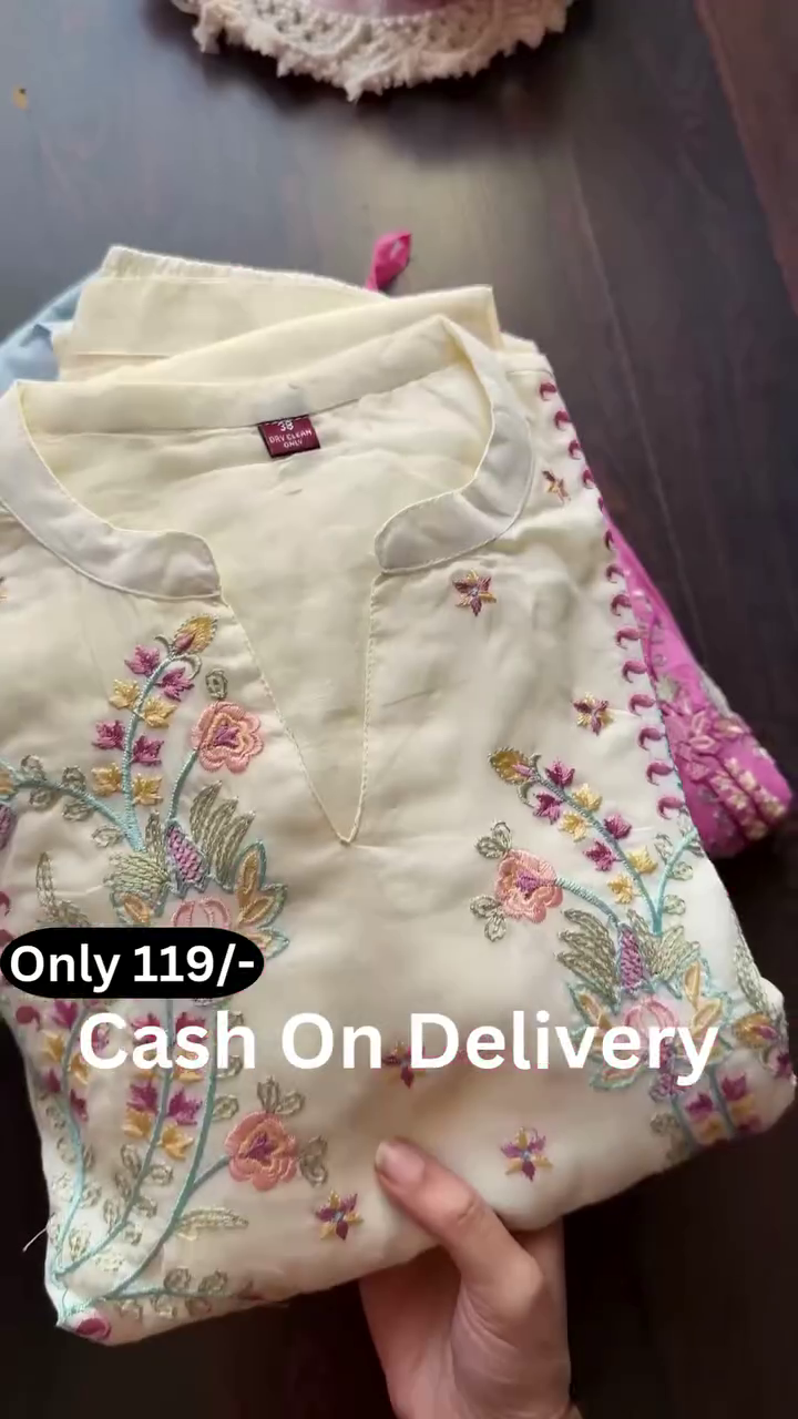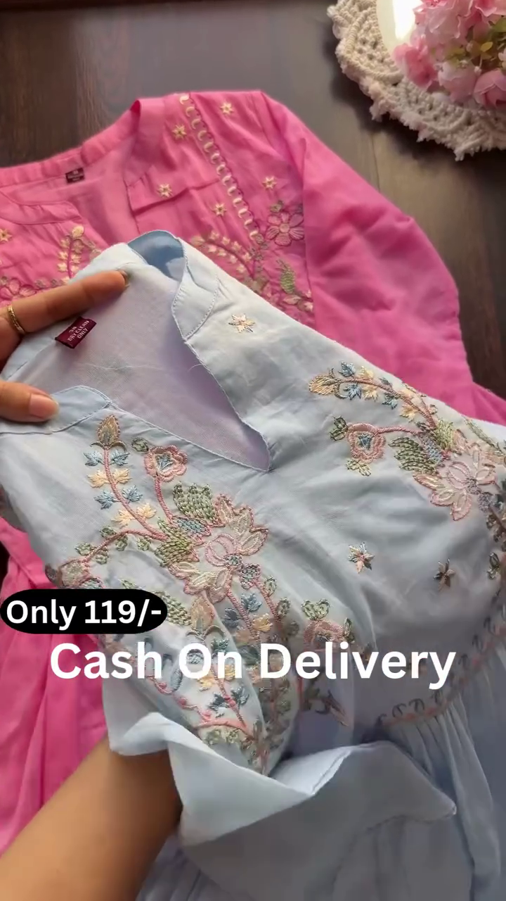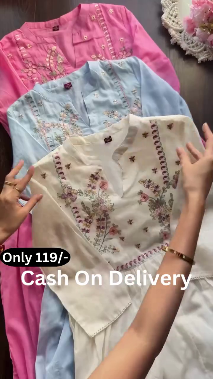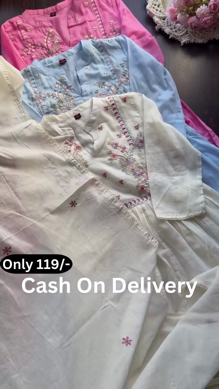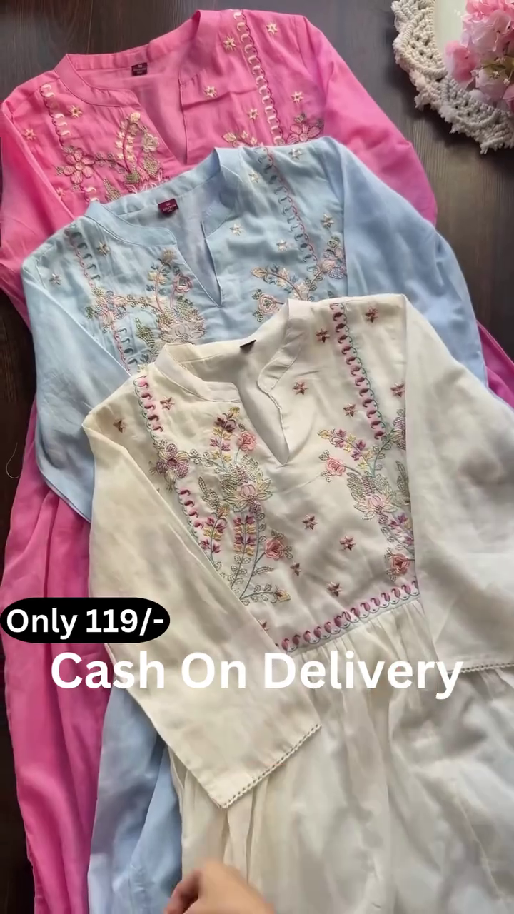 The overall presentation, enhanced by the neatly arranged display and soft background elements, emphasizes grace and femininity. This pastel embroidered kurta collection offers a blend of simplicity, comfort, and delicate artistry—perfect for those who prefer refined ethnic wear with subtle detailing and timeless appeal.
