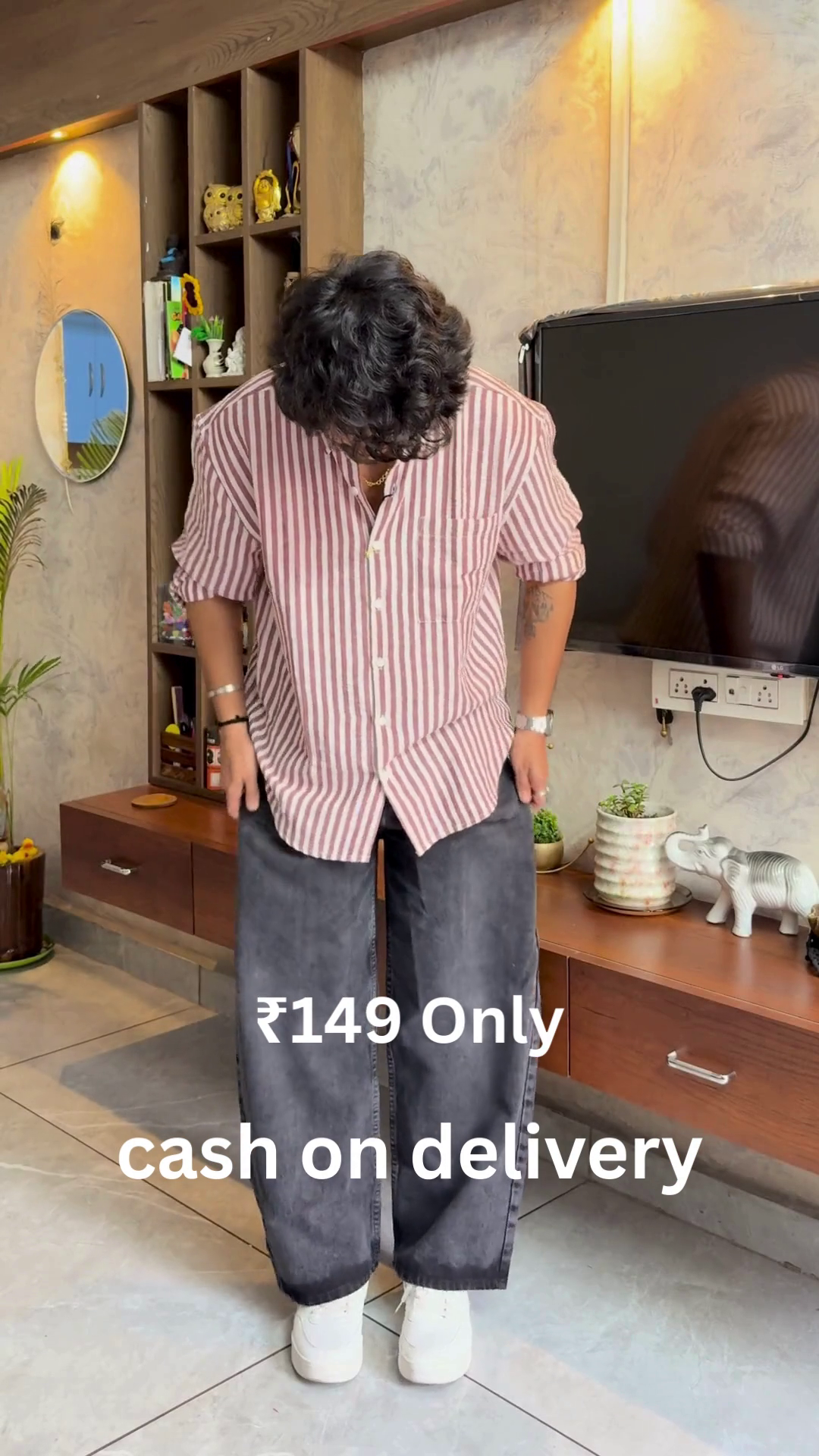 Upgrade your everyday fashion game with this effortlessly stylish men’s outfit featuring a striped button-down shirt paired with relaxed wide-leg trousers. Priced at just ₹149 with cash on delivery available, this look perfectly blends comfort and modern street-style aesthetics. The shirt showcases vertical stripes in muted red and white tones, creating a clean and elongated silhouette that flatters all body types. The vertical pattern not only enhances height visually but also gives a crisp, structured appearance.