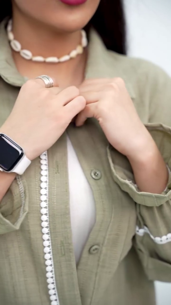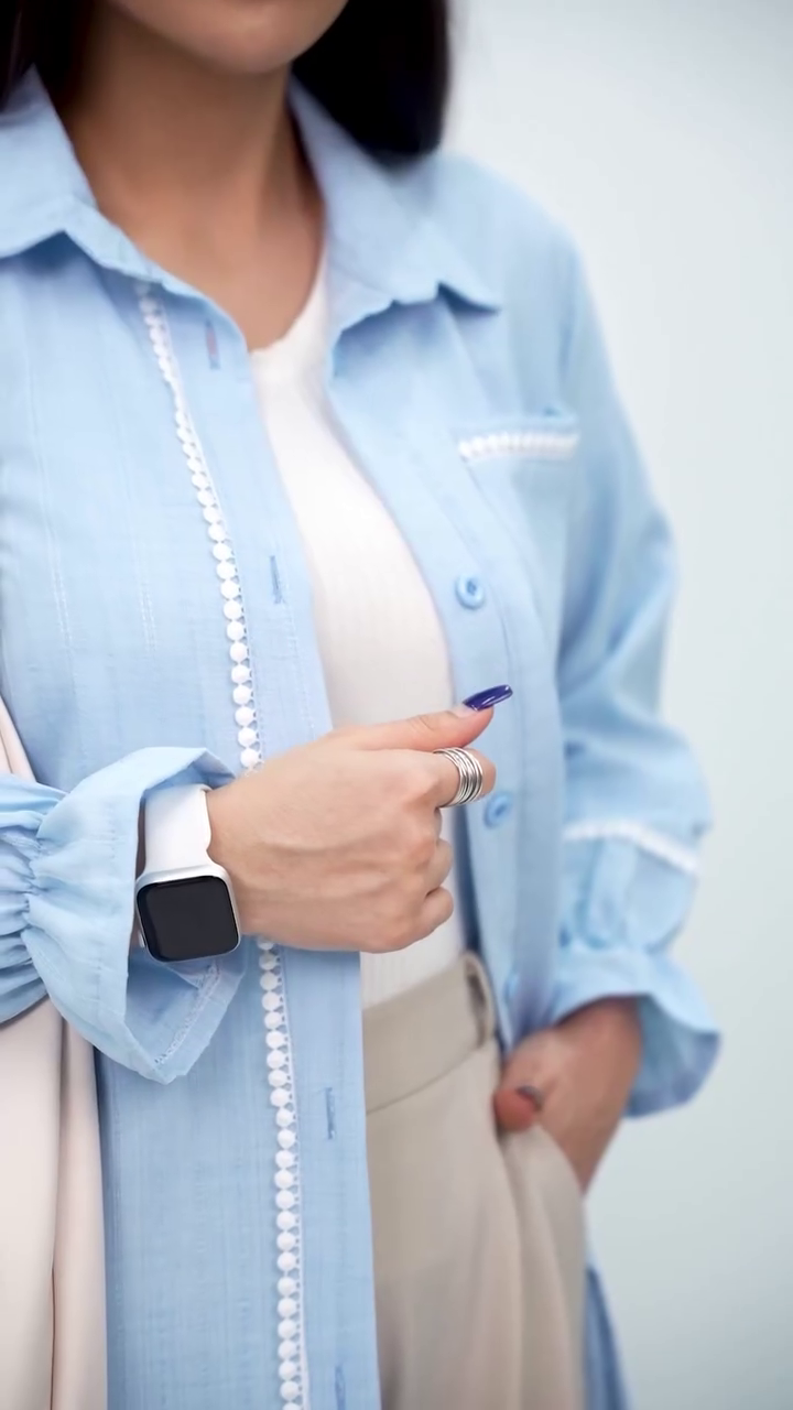 The addition of a cream tote bag and subtle jewelry complements the outfit without overshadowing its clean lines. This shirt pairs well with trousers, jeans, or skirts, making it highly versatile.