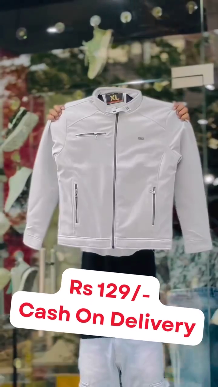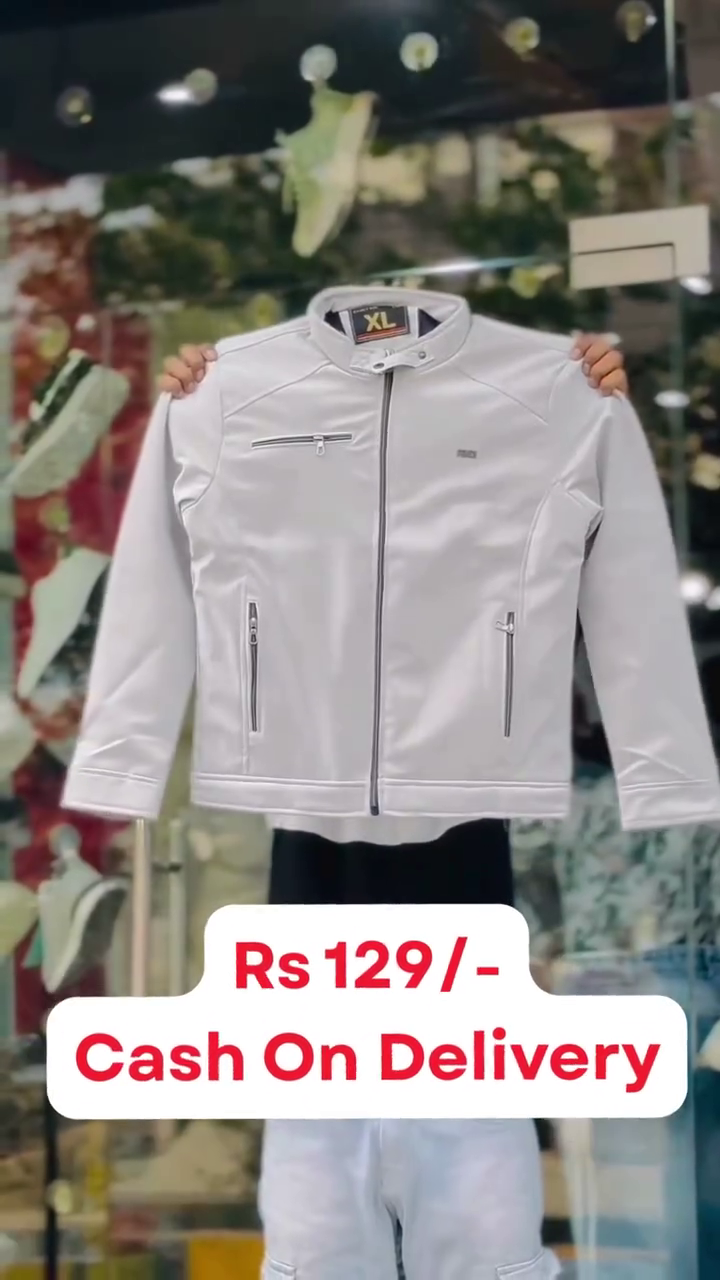 The promotional text overlay reads “Rs 129/- Cash On Delivery,” making it highly attractive for budget-conscious shoppers. The cash-on-delivery option builds trust and convenience, encouraging quick purchase decisions. The retail background with greenery and store lighting creates a premium showroom vibe, highlighting the jacket’s crisp finish.