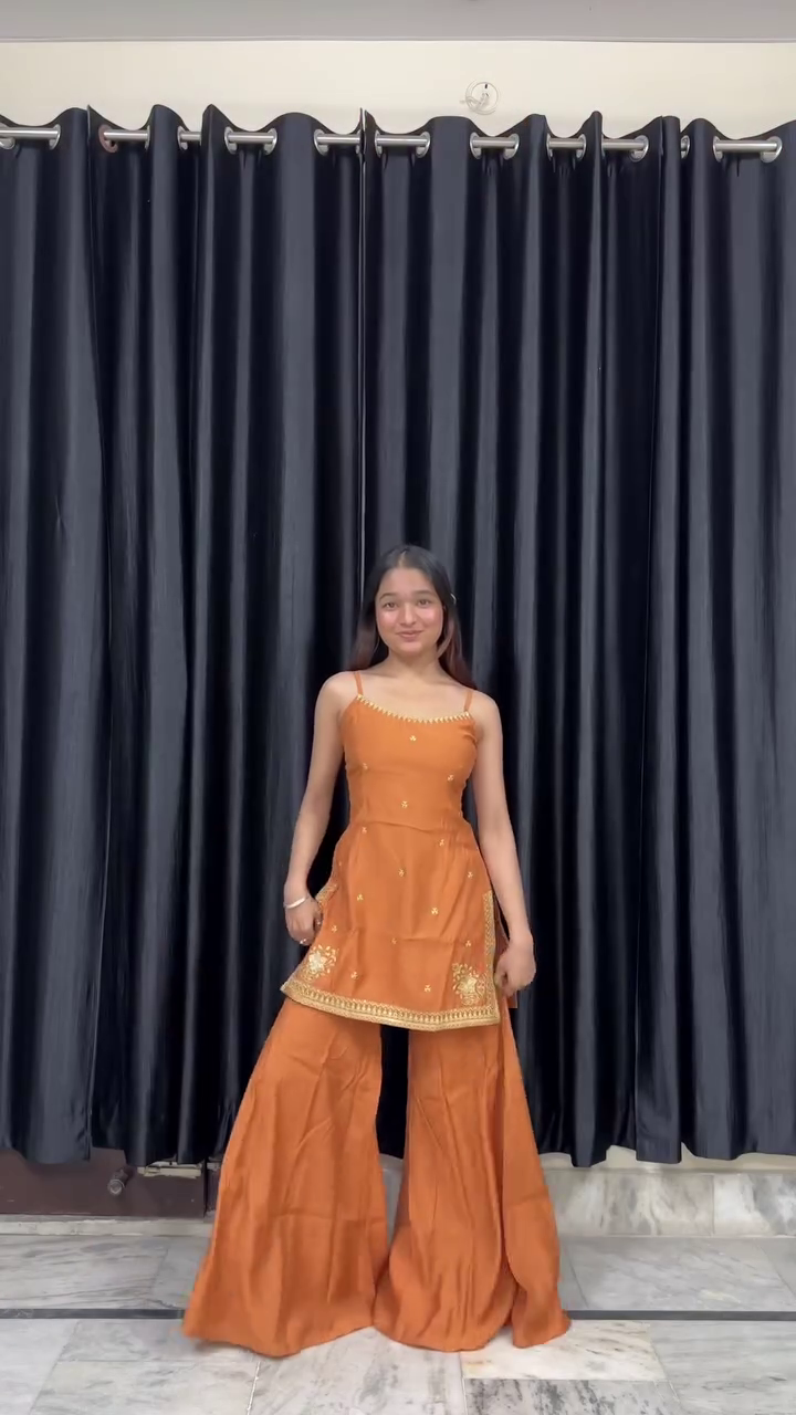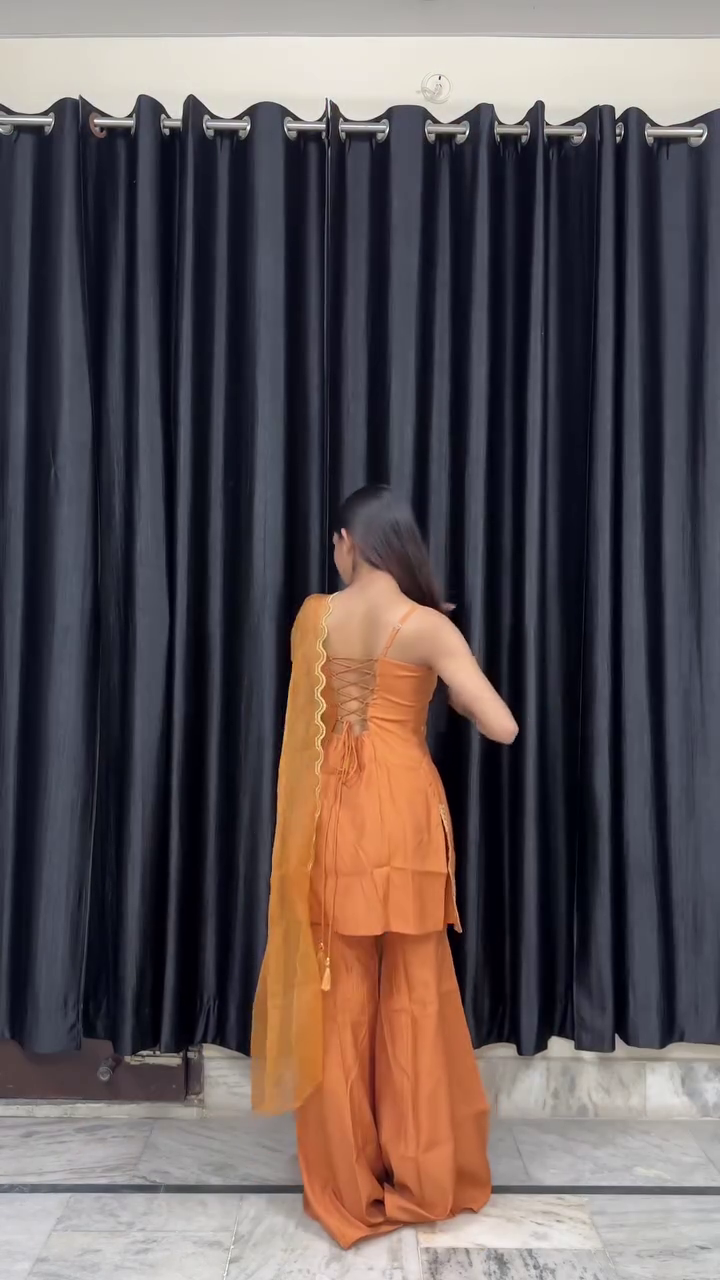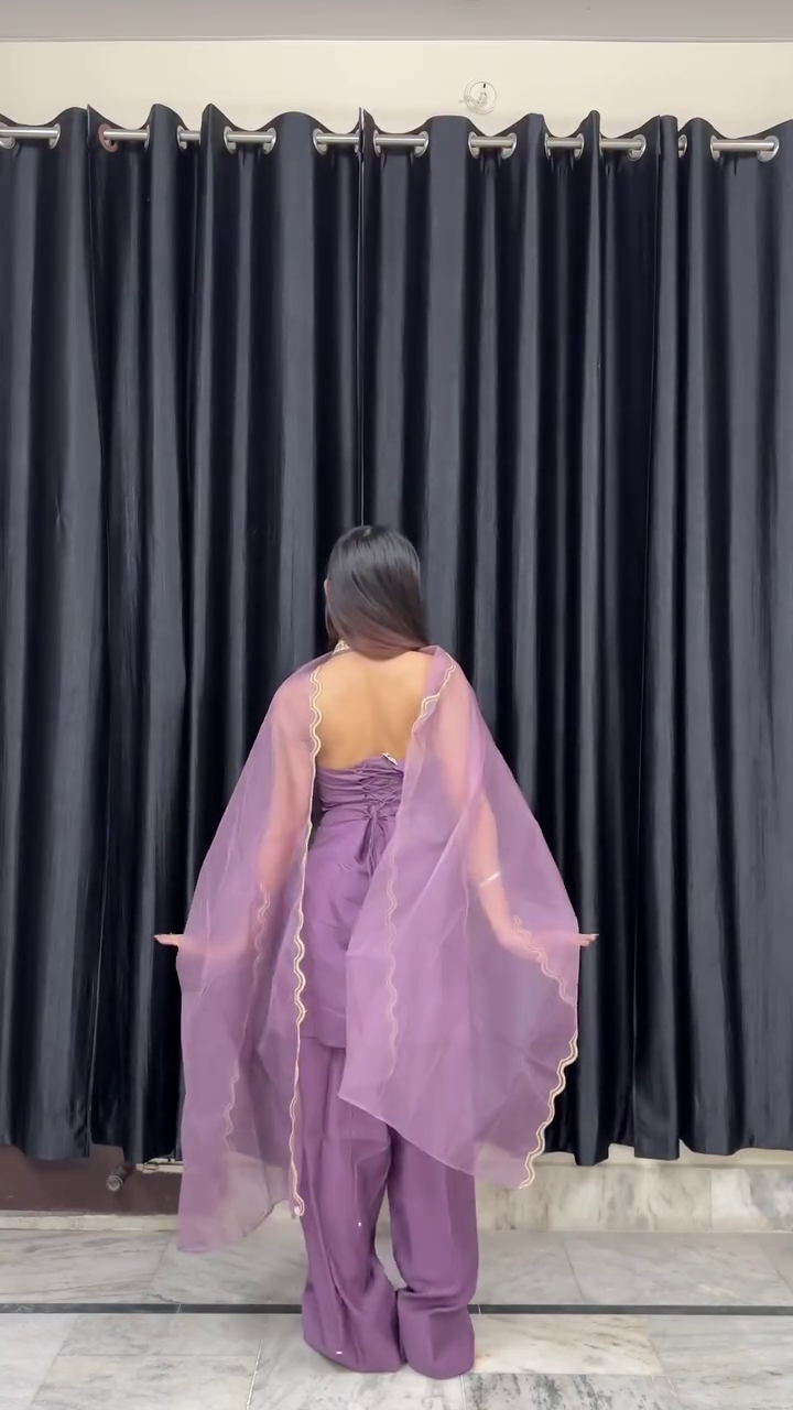 Set against dark curtains, the vibrant color stands out vividly, making the outfit the central focus. The minimal accessories and natural styling allow the design and color to shine independently.